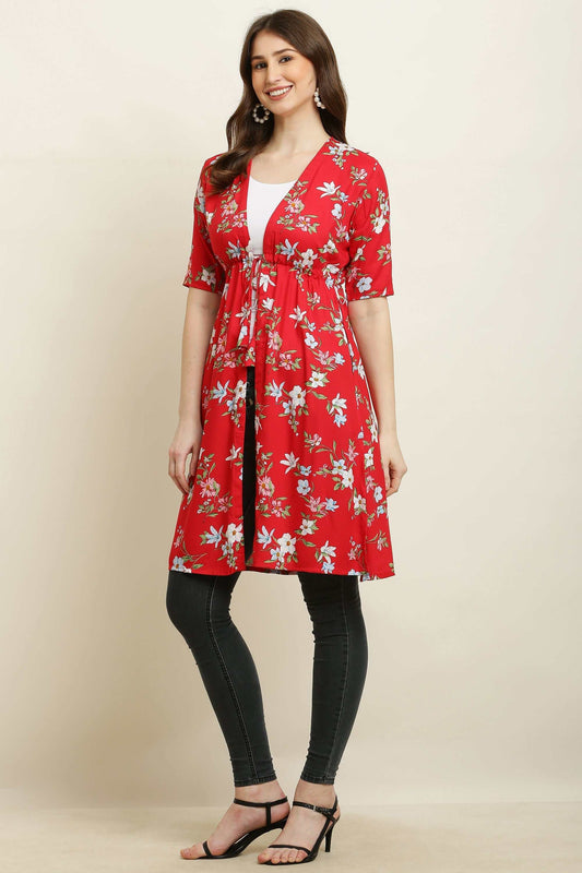 Rayon Printed Stylish Long Shrug Red Flower