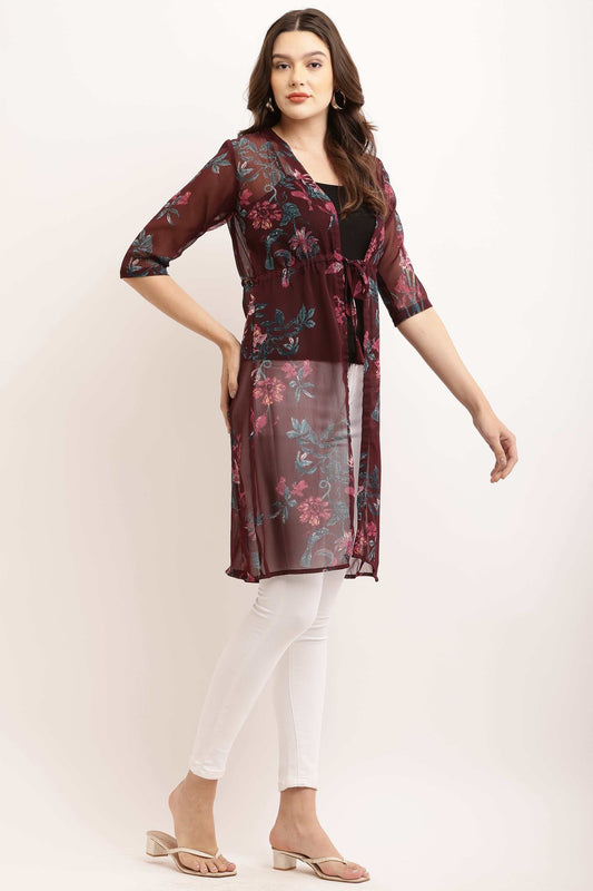 Chiffon Printed Long Shrug - Maroon Flower