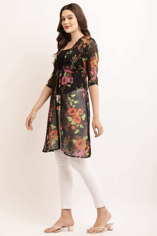 Premium Chiffon Printed Long Shrug Black Flower